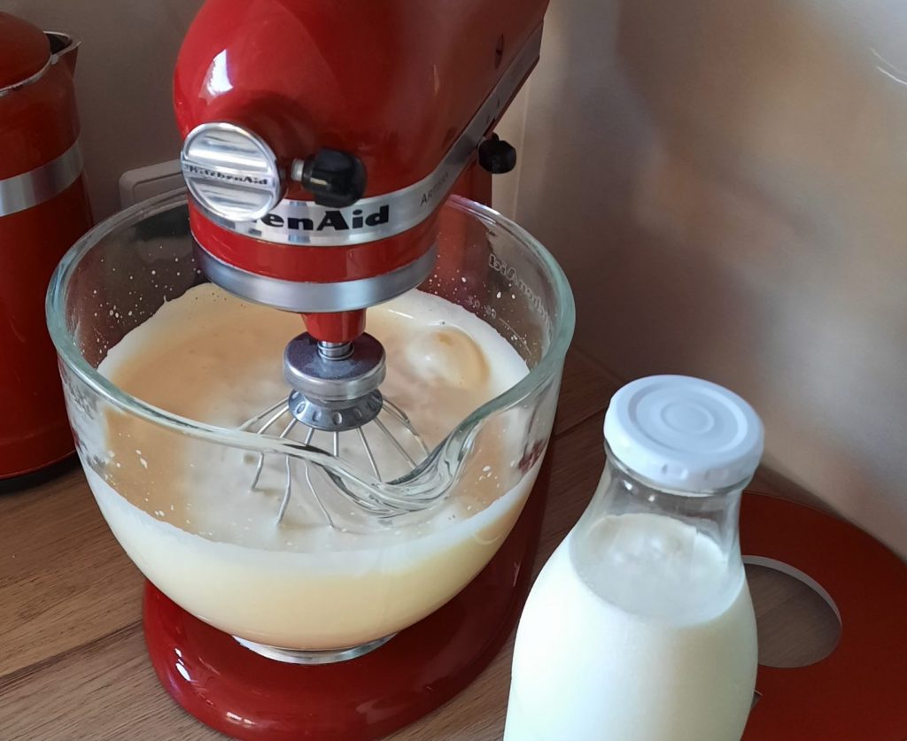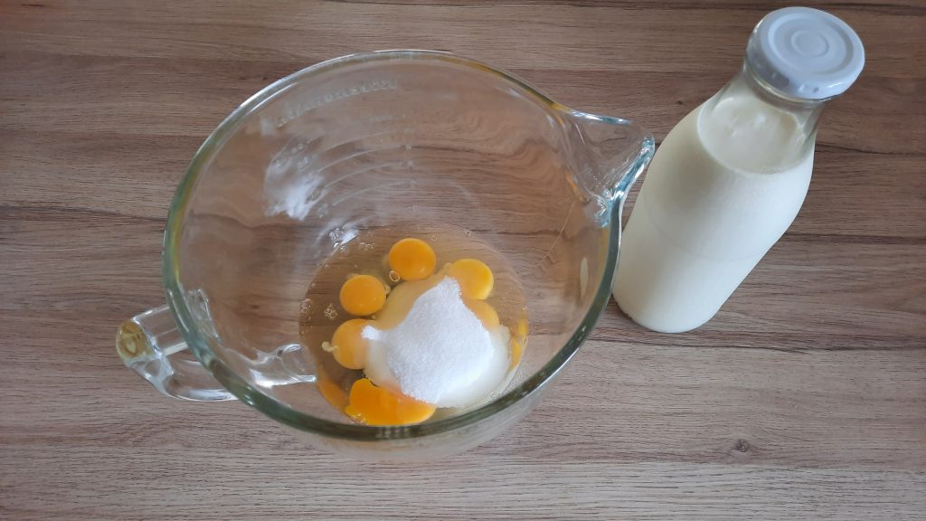 - Die Milch, die Eier und den Zucker und evtl. Vanillin Zucker oder Vanilleschote verrühren. Ich mache das mit der Küchenmaschine, es geht am schnellsten.