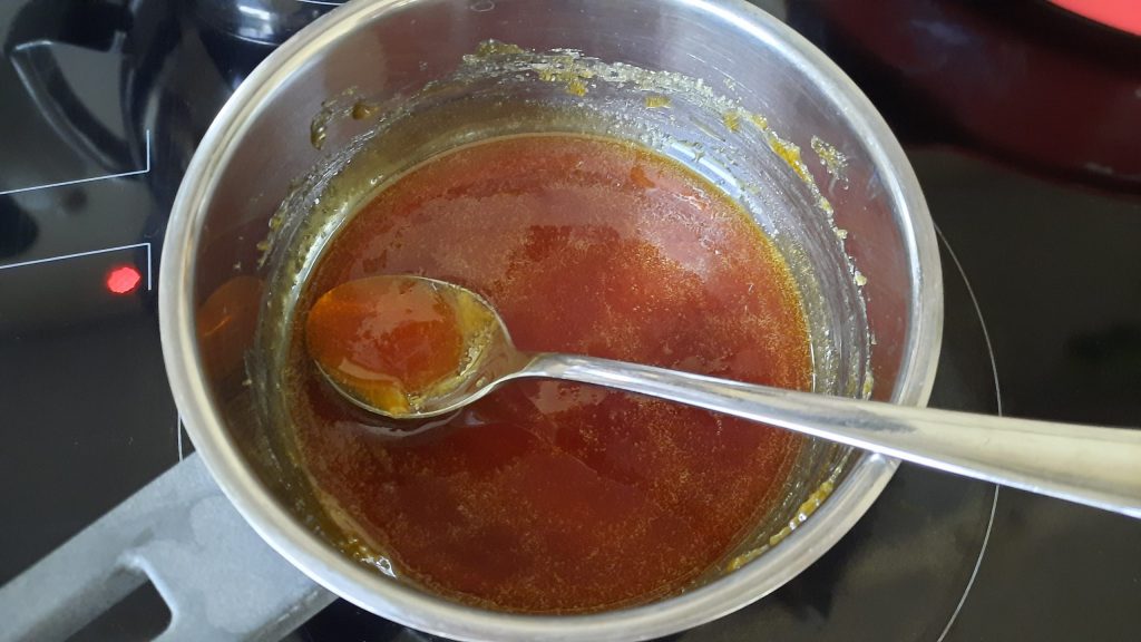 2. Den restlichen Zucker als Karamell schmelzen lassen, bei ganz schwacher Hitze, ohne mit einem Löffeln zu rühren! Aufpassen, dass der Zucker nicht verbrennt und wenn er bräunlich ist und angenehm nach Karamell riecht, sofort vom Herd nehmen und zügig (er wird sonst zu fest) in die Gläschen gießen.