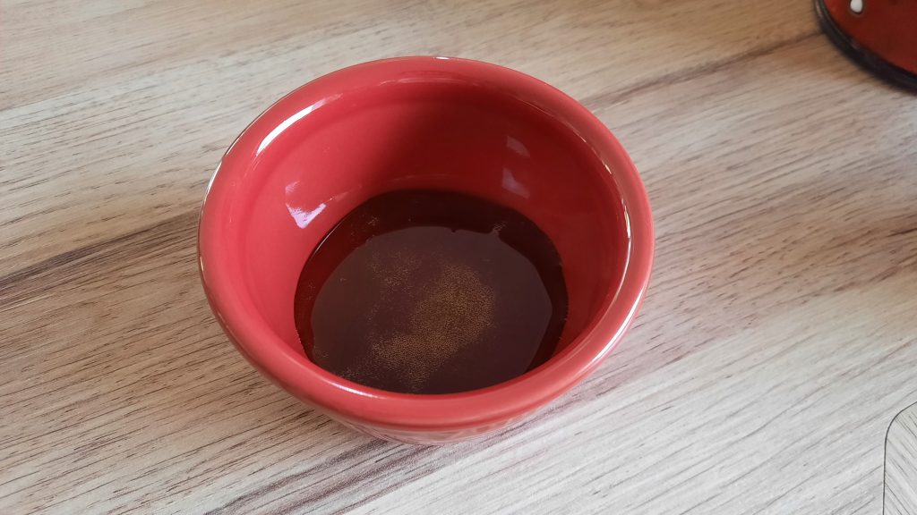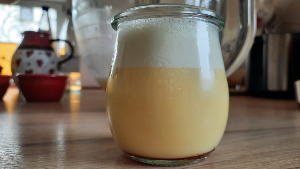 Bei mir ist zu viel Schaum vom Schlagen noch oben, das ist nicht schlimm, einfach sanft mit einem Löffel rühren bis der Schaum weg ist…