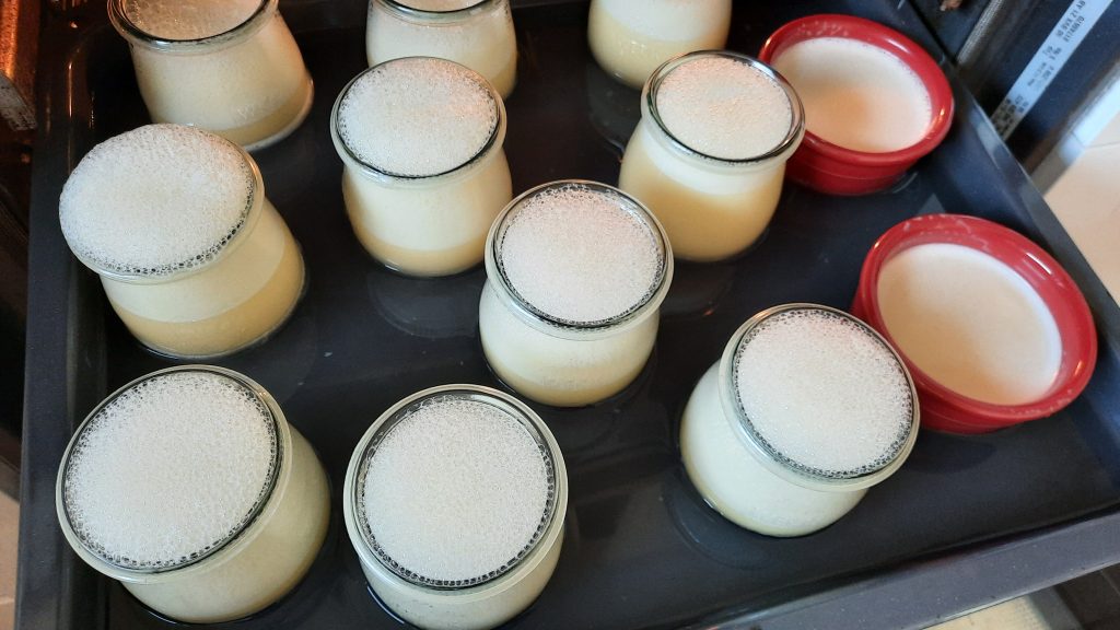 4. Die Crèmes werden ganz sanft im Wasserbad bei 160 °C (kein Umluft!) ca. 45 Minuten oder bisschen länger sogar gebacken. Dafür einfach ein tieferes Backblech nehmen, die Gläschen darauf platzieren und das Backblech mit ca. 1 Liter kaltem (!!) Wasser füllen. ACHTUNG: das Wasser darf nicht aufkochen!