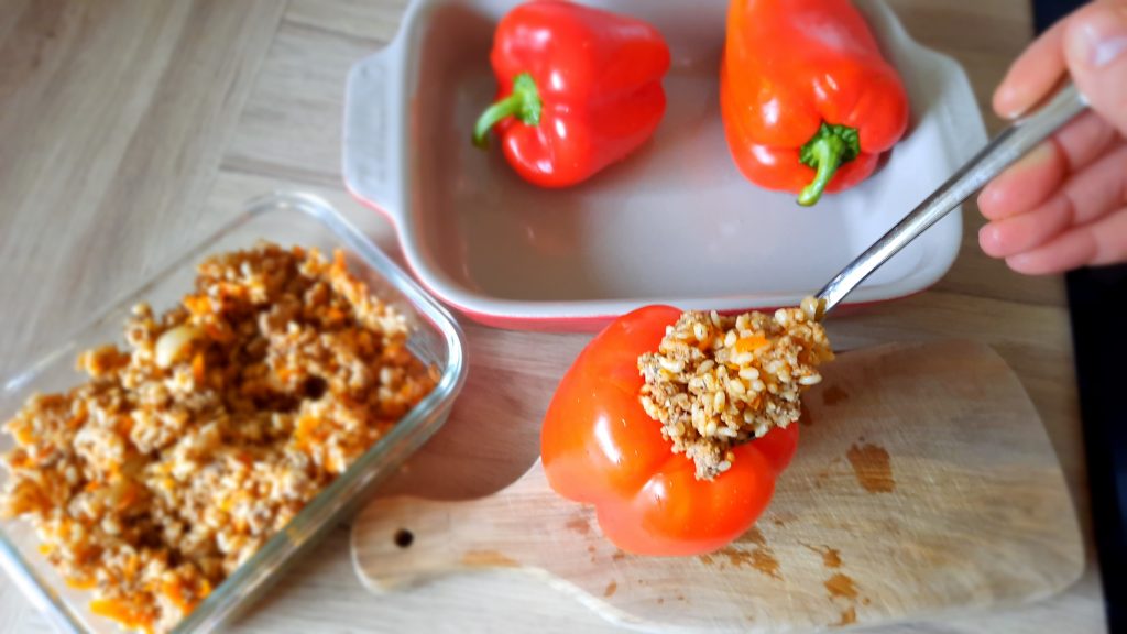 3. Die Paprikaschoten mit der Reis-Hackfleisch-Mischung füllen.