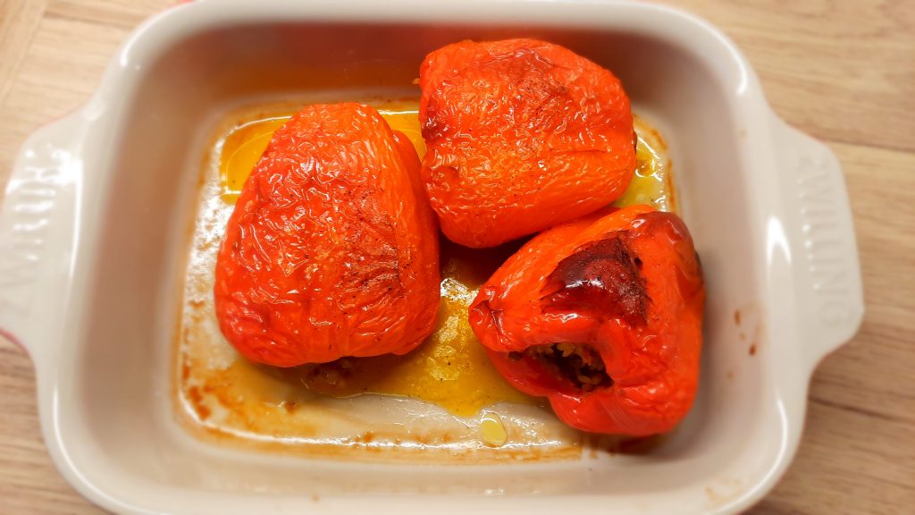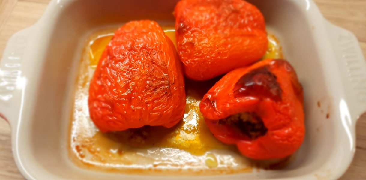 4. Die Paprikaschoten in einer feuerfeste Form geben, etwas salzen und außerdem noch bisschen Öl und Wasser aufgießen. Die Paprikaschoten bei ca. 180°C Umluft ca. 20-30 Min. backen.