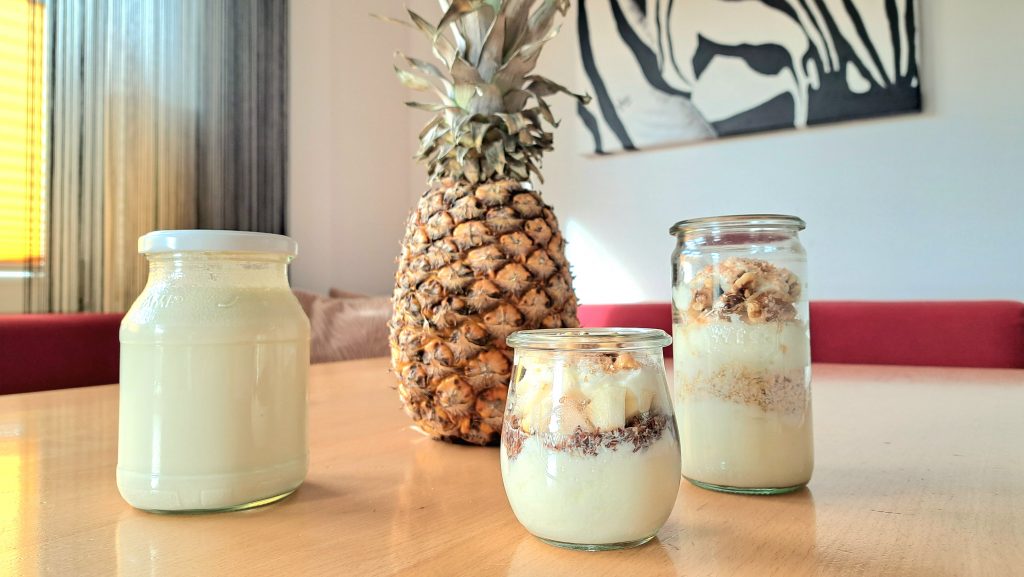 Man braucht lediglich nur frisch abgekochte Milch, die ich immer direkt vom Bauernhof vom Milchautomat hole. Da die frische Milch vom Bauer roh ist, muss ich sie sowieso Zuhause abkochen. Danach lasse ich sie einfach etwas abkühlen (ca. 40°C oder einfach lauwarm). Für die Milch gilt – je mehr Fett, desto cremiger wird der Joghurt. Man kann selbstverständlich auch Milch vom Supermarkt verwenden, die man Zuhause erwärmen soll. Natürlich braucht man auch die Joghurtkulturen, also einfach den Lieblingsjoghurt als Basis verwenden. Der selbst hergestellte Joghurt wird wie die Basis schmecken. Milch und Joghurt in gewünschten Gläschen vermischen und danach braucht es nur Zeit und Wärme 🙂 Die Wärme gibt es im Winter überall Zuhause und diese kann man super nutzen – Heizkörper, Fußbodenheizung, Kachelofen… Und im Sommer gibt es sonnige Fensterbänke.