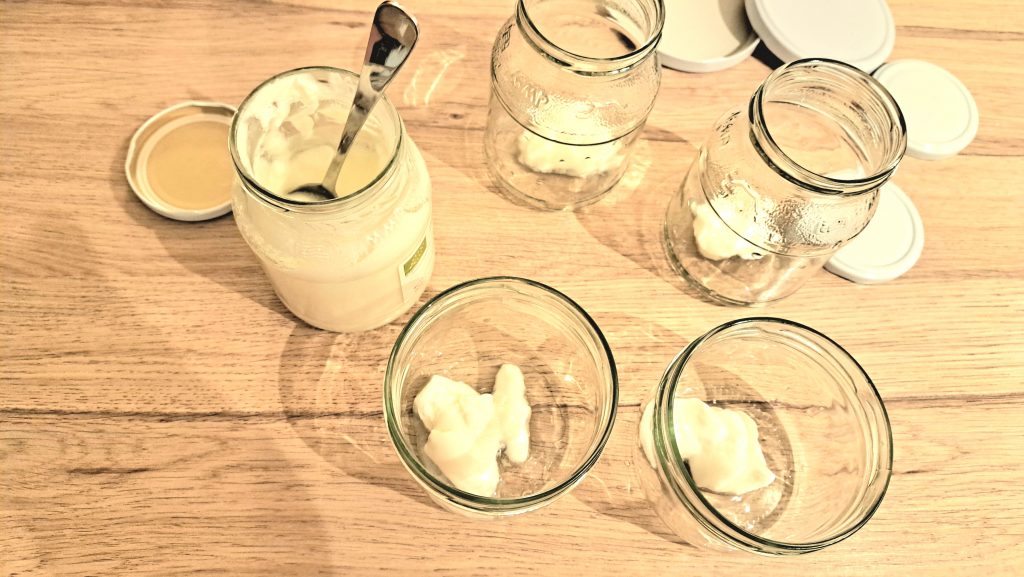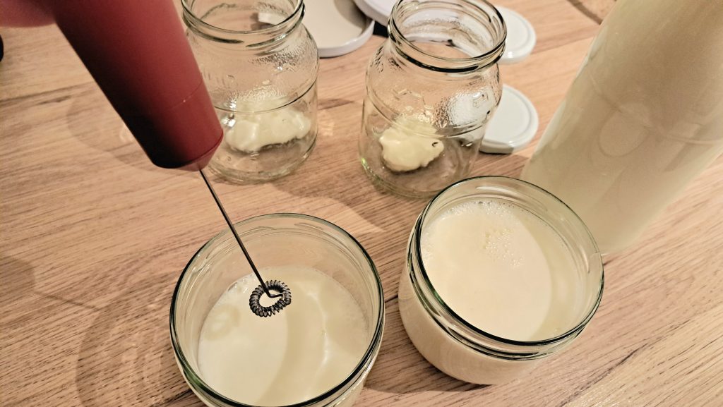 3. Der Lieblingsjoghurt als Basis für die Joghurtkulturen nun in den Gläschen verteilen. Je nach Größe der Gläschen ca. 1 Eßlöffel, in kleineren Gläschen auch weniger. Die lauwarme Milch dazugeben und gut verrühren. Ich helfe mir mit einem kleinen Handmixer mit Batterien (gedacht eigentlich zum Milschaufschäumen), verrührt perfekt und schnell.