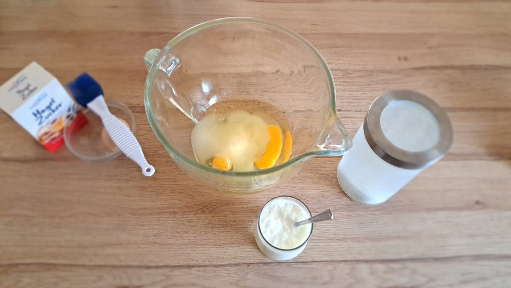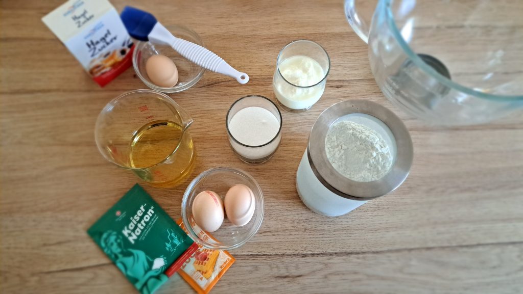 1. Zuerst das Natron mit dem Joghurt verrühren. Natron gibt man NIE einfach zu den anderen Zutaten, man verrührt es immer zuerst mit dem Joghurt. Man sieht wie die Joghurt-Natron Mischung anfägt zu schäumen und zu arbeiten. Alle restlichen Zutaten (Eier, Zucker, Öl und Vanillin Zucker) in eine Rührschüssel geben. Nach einigen Minuten auch die Joghurt-Natron Mischung dazugeben und alles mit der Küchenmaschine verrühren.