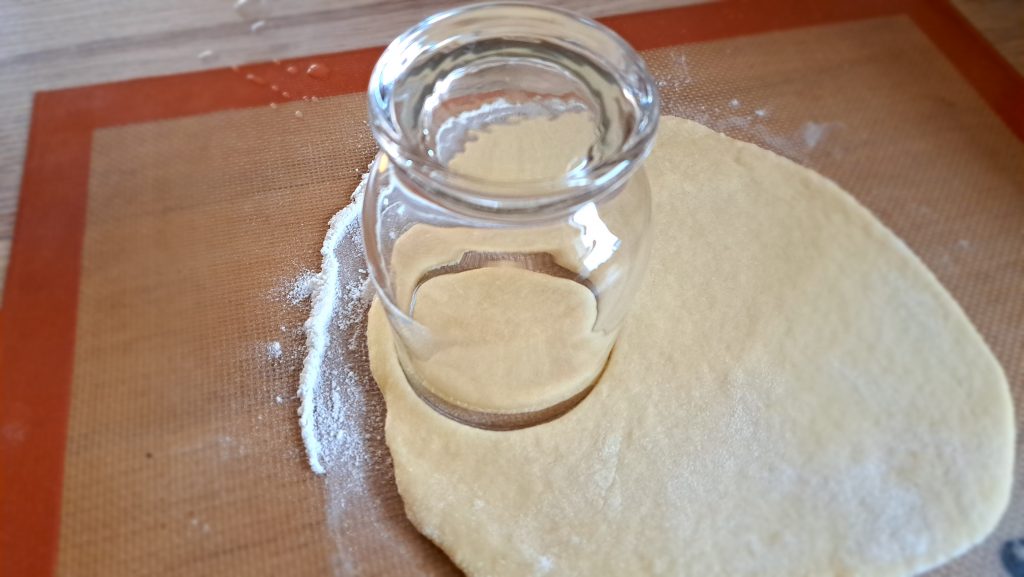 3. a) Jetzt kann man den Teig ausrollen und mit einem Glas Kreise oder Monde ausstechen: