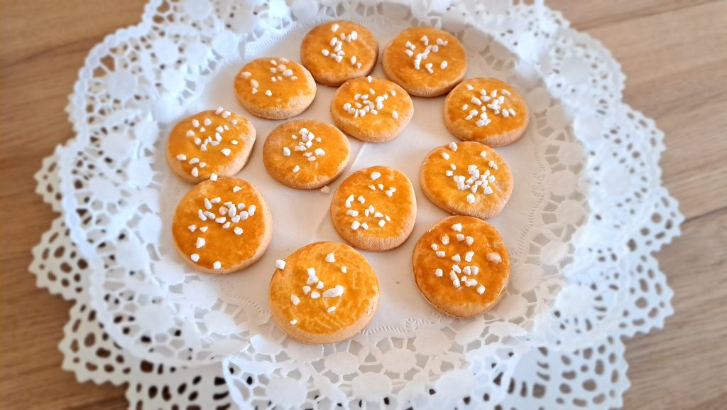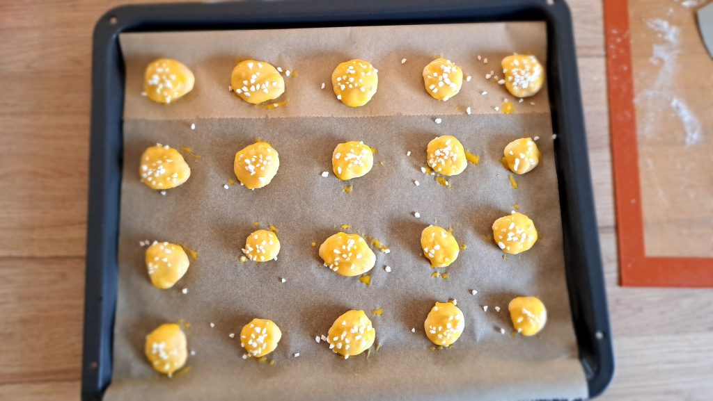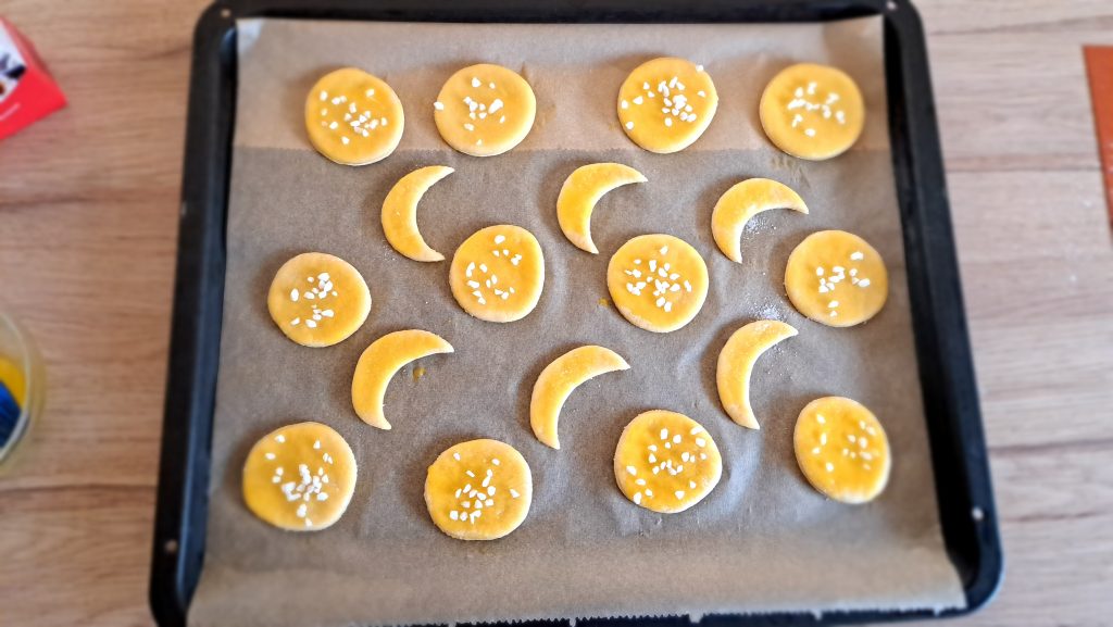 4. Alle Kekse werden mit dem Eigelb bestrichen und mit dem Hagelzuckel bestreut. Auf dem Balkan bestreut man sie eigentlich mit normalem Zucker, ich finde den Hagelzucker schöner.
